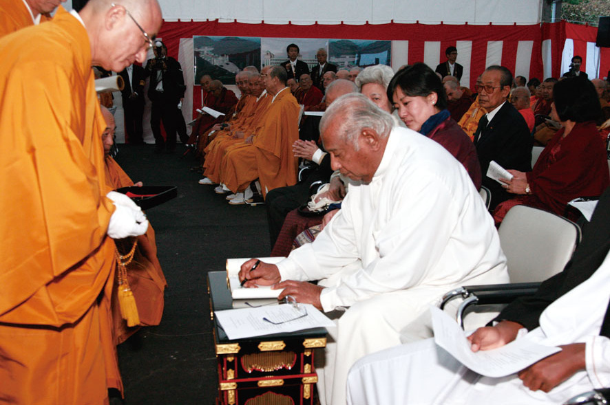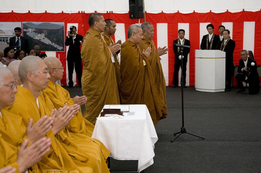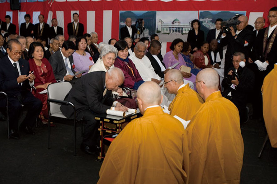 「佛教之王堂」落慶法要に続いて、ナーランダ僧院地鎮式が、カンボジア王国ノロドム・ シアヌーク前国王陛下・皇太后陛下をはじめとする来賓の方々、並びに、世界32ヶ国の仏教最高指導者御臨席の下、執り行われました。