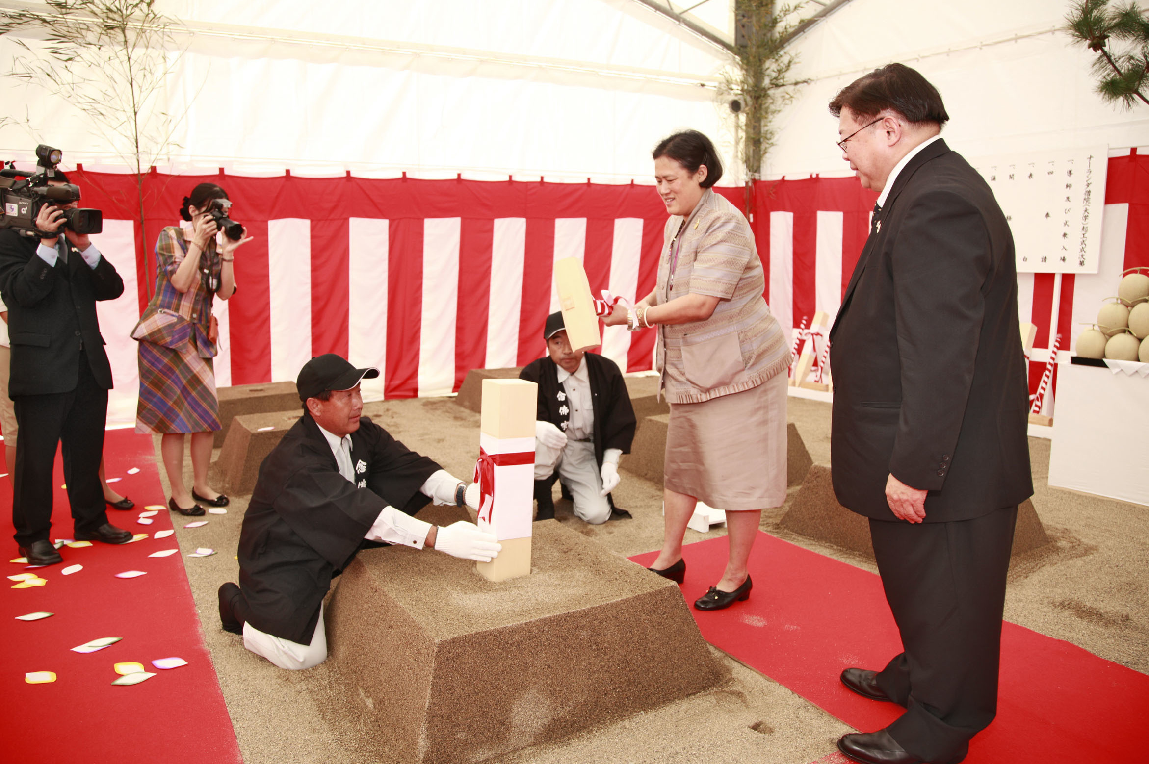 式典には、タイ王国より、マハー・チャクリ・シリントーン王女殿下を主賓としてお迎えし、世界十三ヶ国の駐日特命全権大使閣下御夫妻の御臨席を賜りました。王女殿下より主賓御挨拶を賜った後、杭打の儀が執り行われ、ナーランダ僧院建立への槌音が、三草山に高らかに響き渡りました。